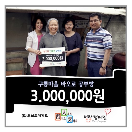 구룡마을 바오로 공부방에 즐거운 나눔 실천! ​두뇌로 인재로 장학회 첫 Start! 3백만원 기부!안녕하세요. 명랑캠페인입니다… 더보기